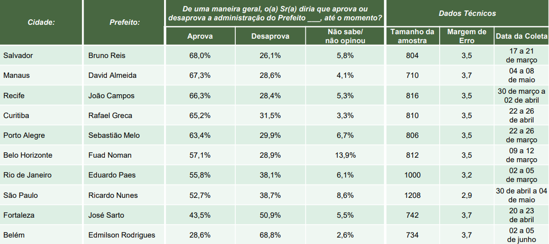 Na segunda posição aparece o prefeito de Manaus, David Almeida, com 67,3% de aprovação e 28,6% de desaprovação. Ele é seguido por João Campos, prefeito de Recife, que soma 66,3% na avaliação positiva e 28,4% de desaprovação.