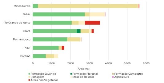 Do total de hectares ocupados pelas usinas de produção de energia solar, cerca de 3.800 estão localizadas na caatinga baiana, representando o segundo maior contingente entre os estados analisados. Destacando a problemática do desmatamento no bioma, nesta área ocupada por usinas no território baiano, a maior parte das usinas, cerca de 71% está localizada em áreas de vegetação savânica nativa, um total de 2753 ha. O estado fica atrás apenas de Minas Gerais, que registra 26% do contingente total, o equivalente a 5,6 mil ha.